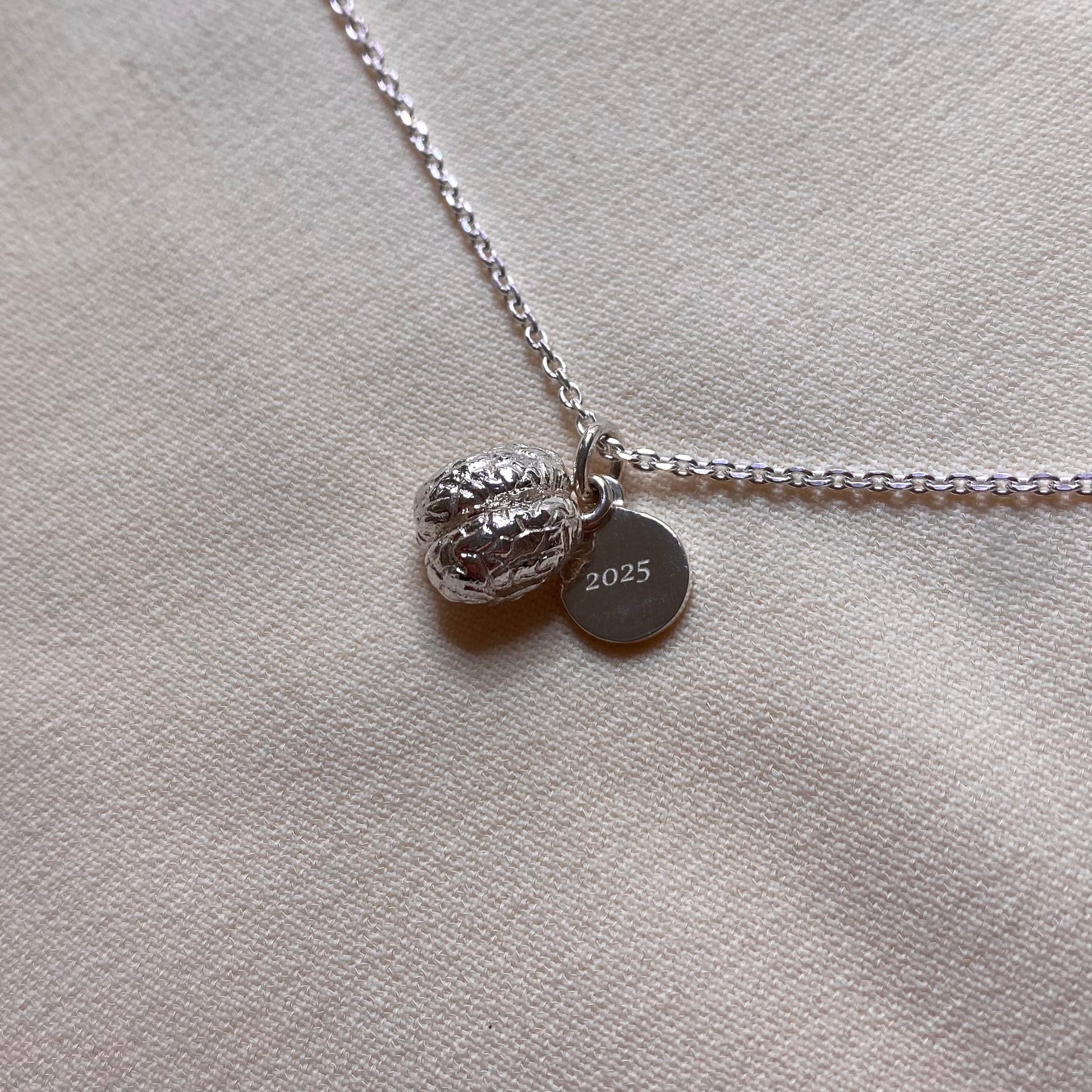 Al ciondolo cervello é possibile abbinare una targhetta tonda sulla quale aggiungere un’incisione personalizzata.