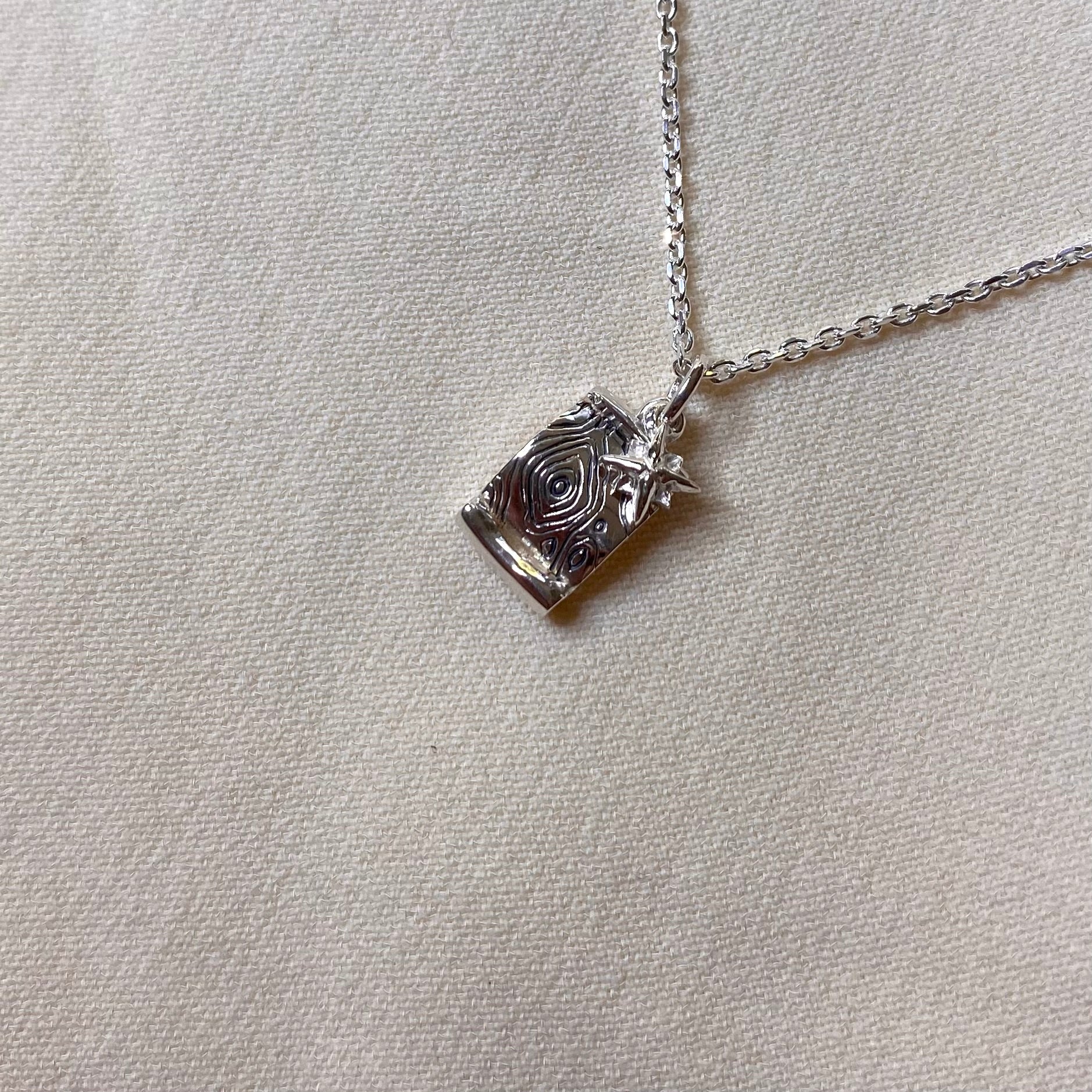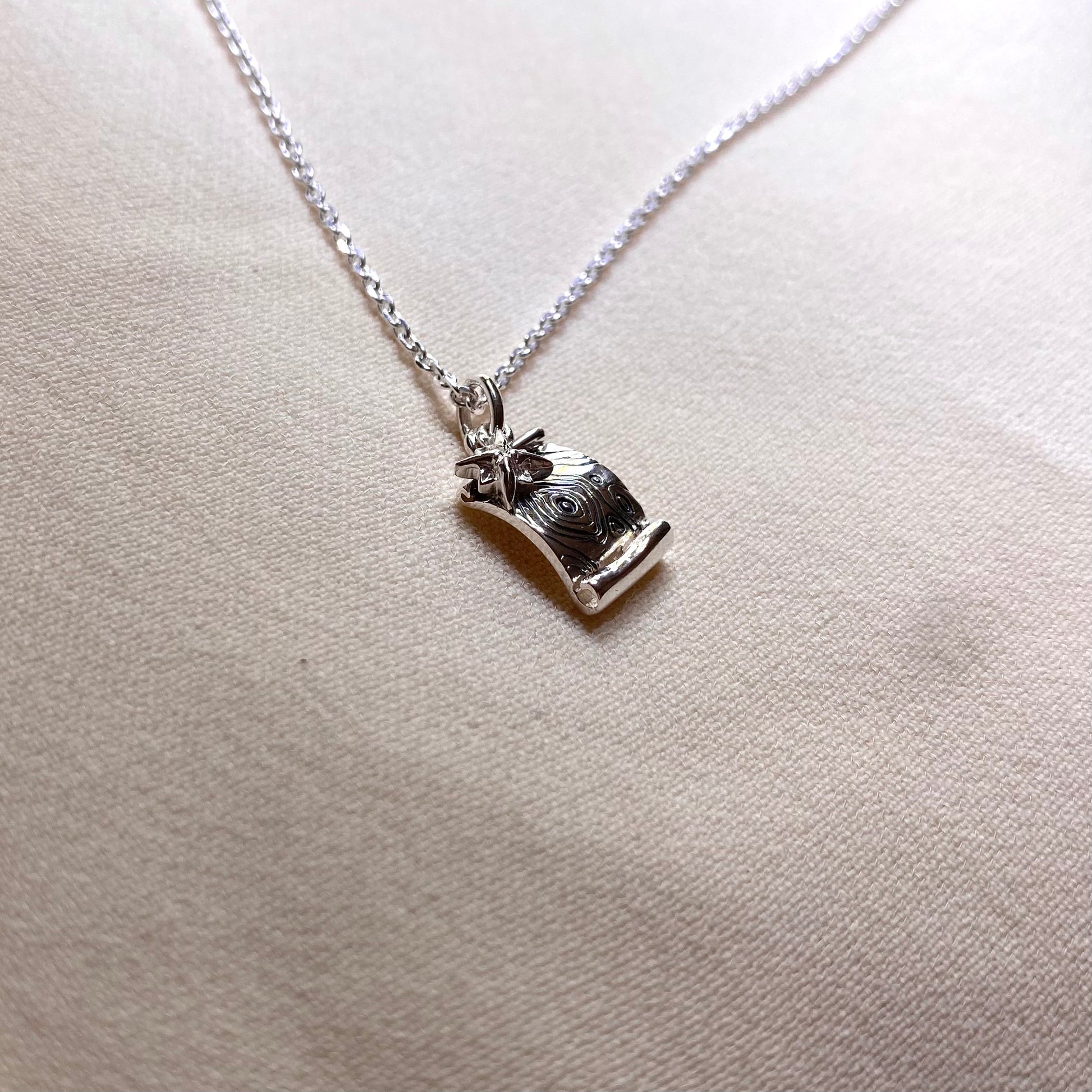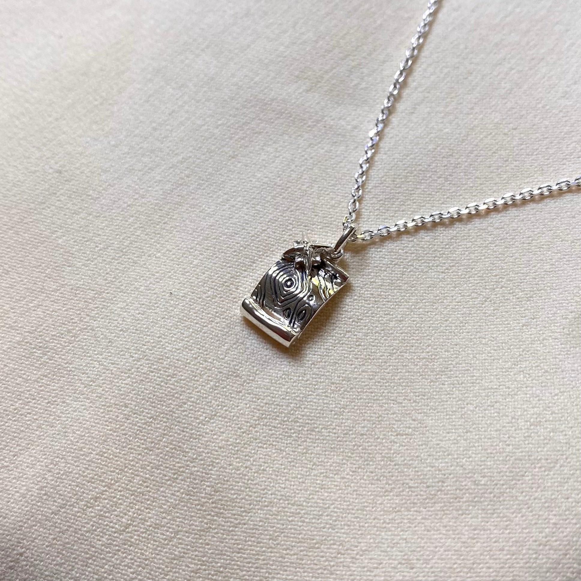 Questo ciondolo vede come protagonisti due elementi scolpiti interamente a mano e uniti nella stessa contromaglia.