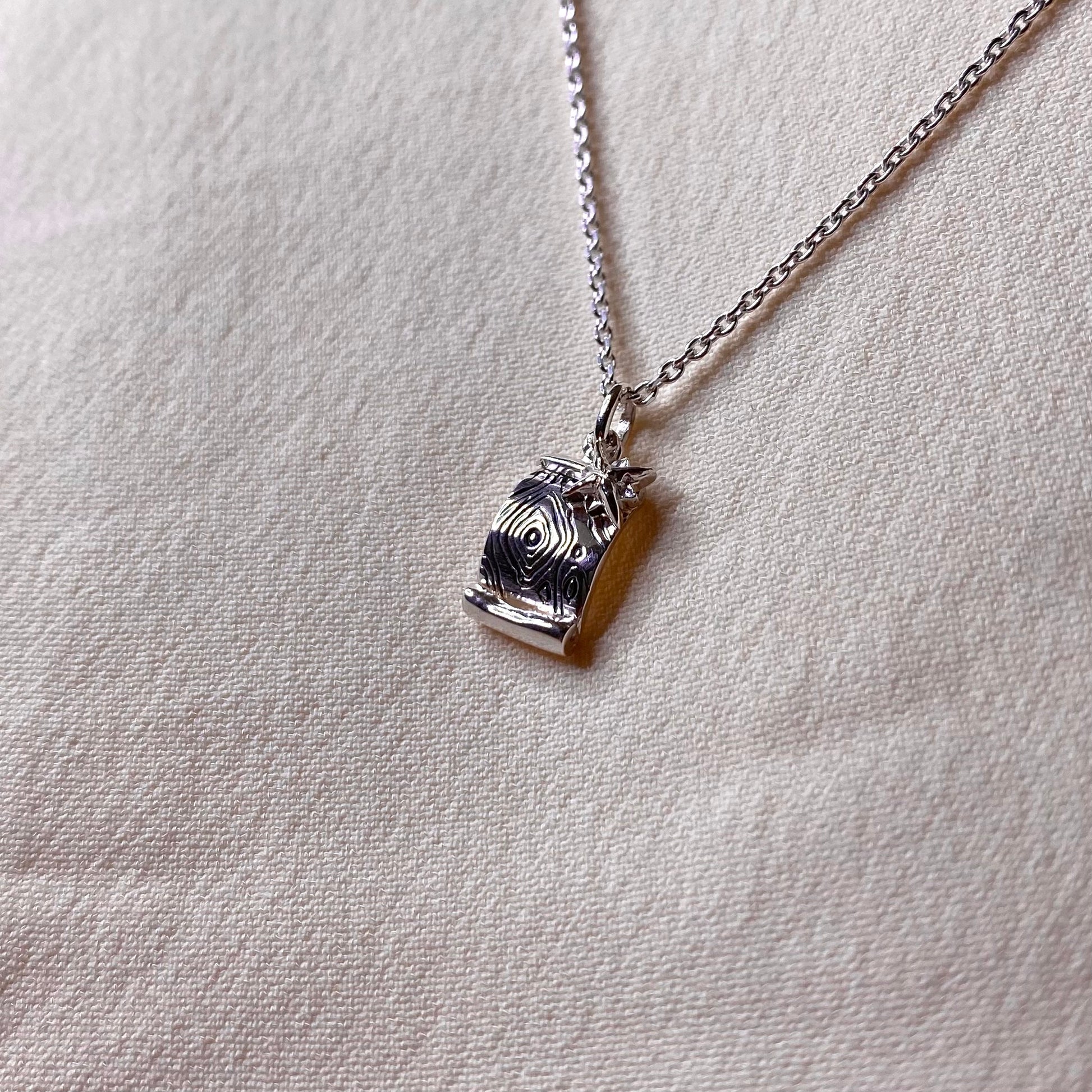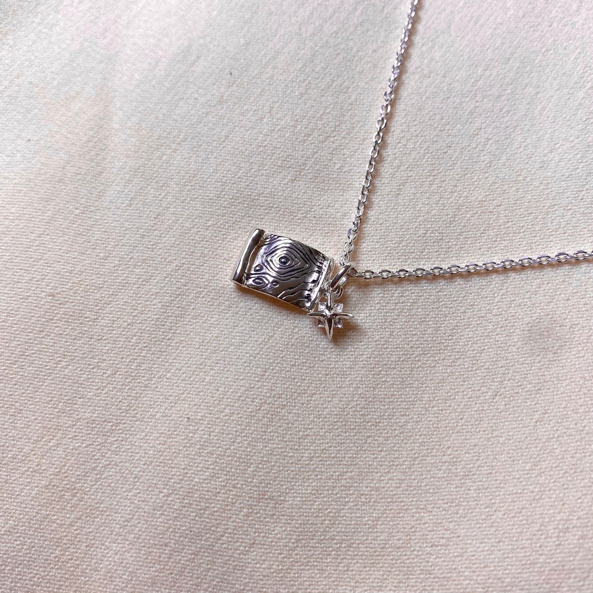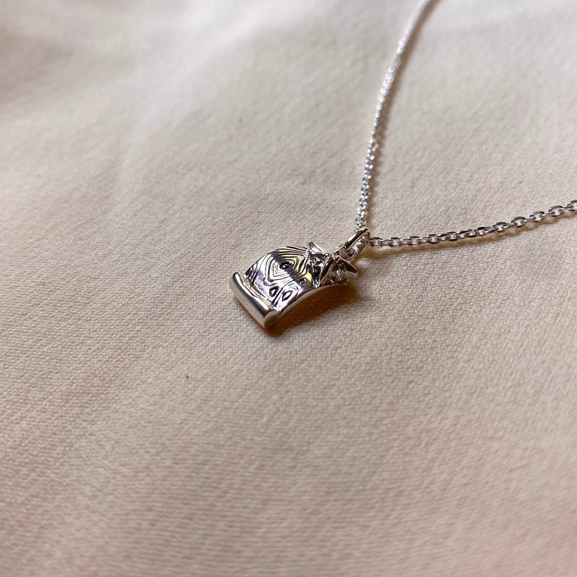 Questo ciondolo vede come protagonisti due elementi scolpiti interamente a mano e uniti nella stessa contromaglia.